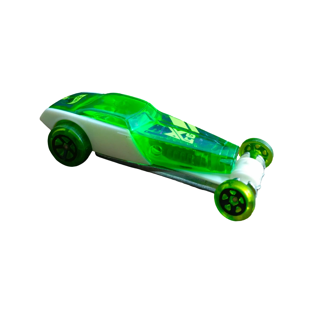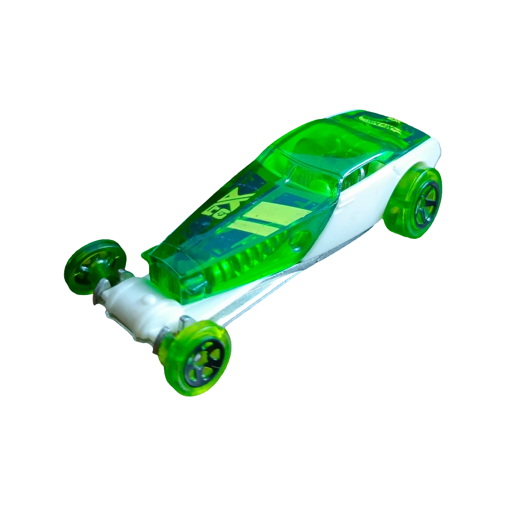 A small, aerodynamic toy car with a transparent green canopy, white body, and green wheels. The design includes a stylized “X” on the side, suggesting a connection to a sci-fi or superhero theme