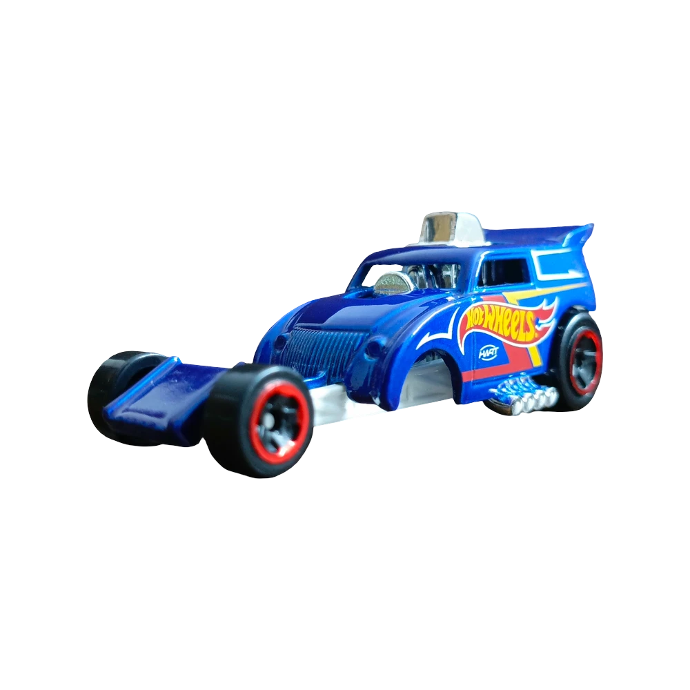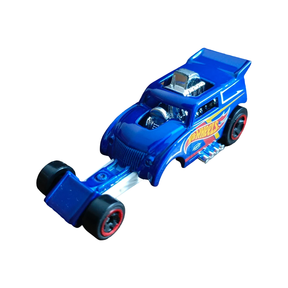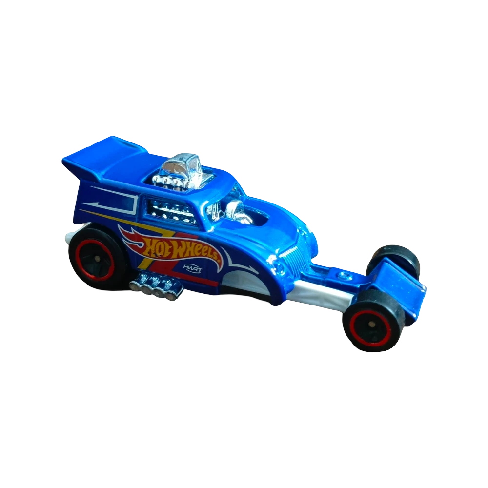 This Hot Wheels die-cast car is a bold representation of classic American hot rod culture. Featuring a blue and yellow paint job with striking flame decals, a massive chrome engine block, and oversized rear wheels for dragster appeal, this model captures the thrill of speed and power. Built with intricate detailing and a durable metal chassis, it’s perfect for collectors and enthusiasts alike.”