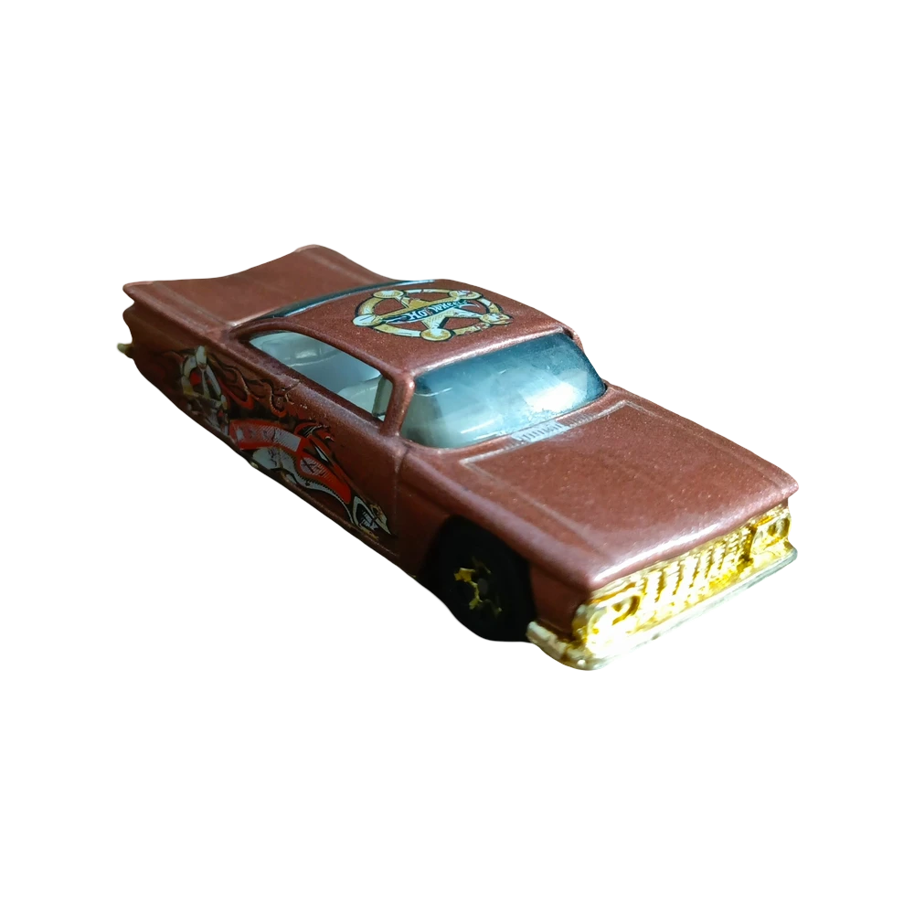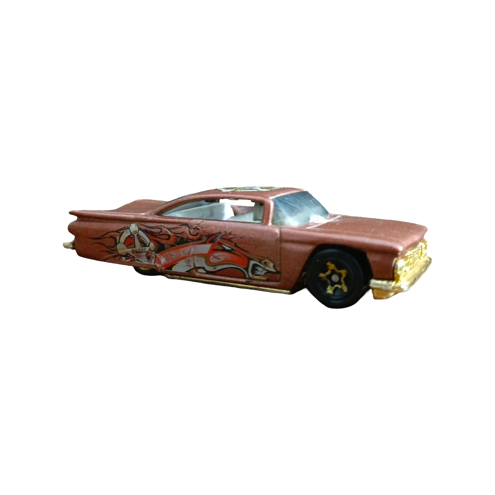 This toy car is a detailed miniature model inspired by 1930s hot rods, featuring a reddish-brown body with black accents and vibrant flame decals on the sides. The design includes a boxy cabin, large round wheels, and a retro grille, capturing the essence of classic American cars. Likely part of a Hot Wheels or Matchbox collection, it’s made for play or display.
