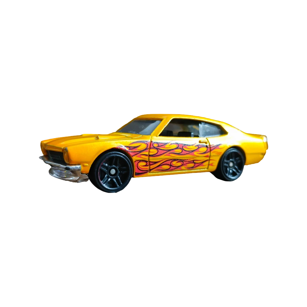This vibrant yellow muscle car toy is a miniature powerhouse packed with attitude. Featuring sleek black wheels and fiery red flame decals along the side, it captures the essence of classic American hot rods. Perfect for collectors and enthusiasts, this die-cast model brings speed and style to any display shelf or toy race track.
