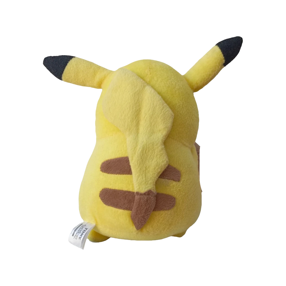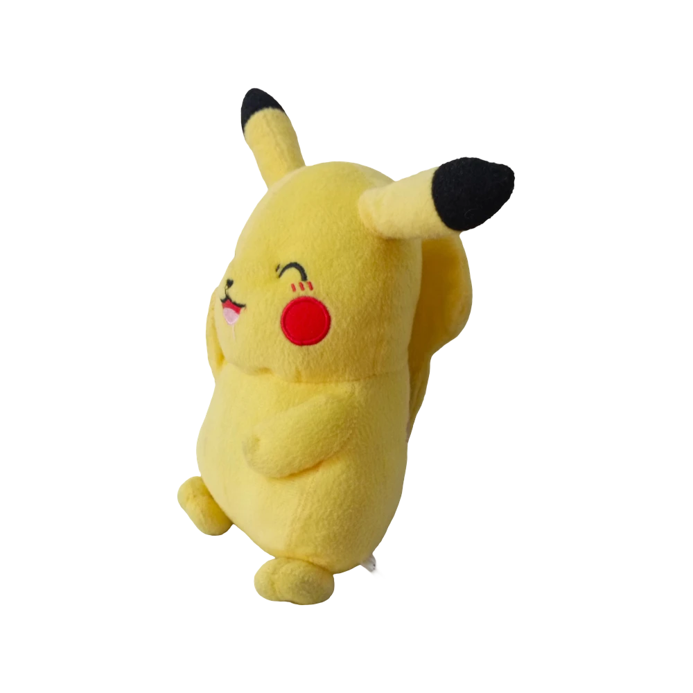 The Pokémon Pikachu Plush is an adorable stuffed toy inspired by the iconic Pikachu character from the beloved Pokémon franchise, perfect for fans, children’s play, or as a collectible item. This plush features a vibrant yellow body, crafted from soft, fuzzy polyester material, with black-tipped ears, red cheek patches, and embroidered facial features, including black eyes and a small smiling mouth, capturing Pikachu’s cheerful and energetic personality. Its design includes a lightning bolt-shaped tail with a brown base, adding to its authentic look. Filled with lightweight polyester fiberfill, the plush maintains its shape while providing a huggable texture, making it comfortable to hold. Pikachu is posed in a seated position with legs spread out and arms resting forward, ideal for display on a bed, shelf, or as a cozy companion during playtime. Suitable for all ages, this Pikachu plush makes a great gift for birthdays, holidays, or as a fun addition to a Pokémon collection. Care instructions recommend spot cleaning or hand washing with mild detergent to preserve the plush material, avoiding harsh washing to maintain its vibrant colors and softness.