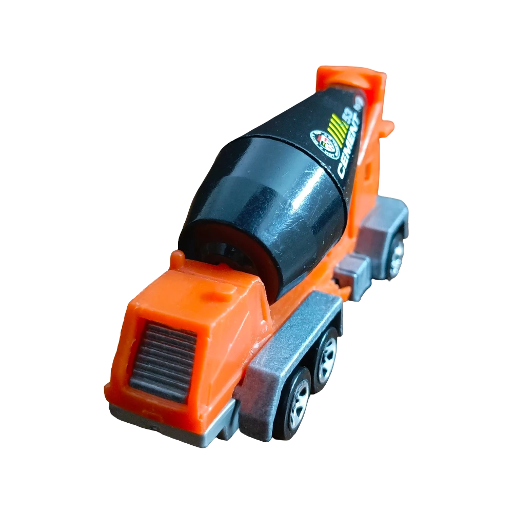 Hot Wheels ‘Cement Truck’, a die-cast toy vehicle with an orange cab and a black cement mixer drum, featuring the label “Cement” and a logo on the drum, part of the Hot Wheels collection.